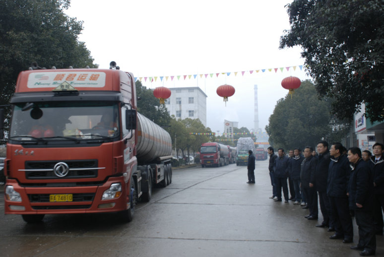 ?1月30日(年初八)上午,物流公司举行发车仪式。8:18分,18辆货车满载公司8个品种的产品,徐徐开出公司大门,驶向全国各地。集团公司董事长吴福胜、股份公司总经理季学勇等公司导为新年次出征的车队送行。吴福胜发表简短祝词,祝车队路顺风,祝皖维龙年大发。 (方华? 摄影报道)